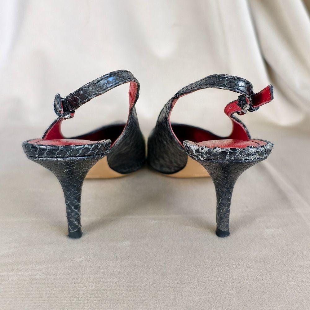 Step out in style with these elegant dark gray snakeskin slingback heels. Love the red insole. Leather soles. Perfect for a night out. In excellent pre-owned condition, some wear on the back on the right shoe, some very minor wear on the toes.