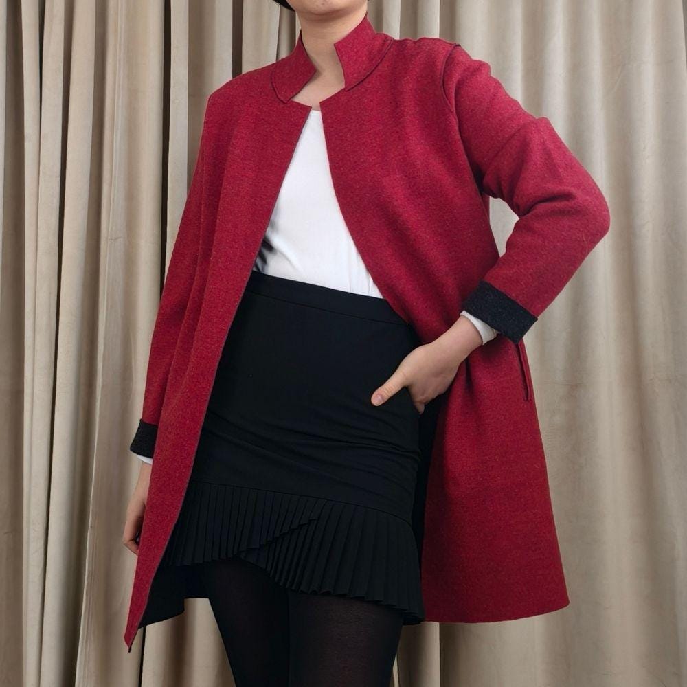 Other features: no closure, stitching detailing, has pockets, double sided wool, not itchy
