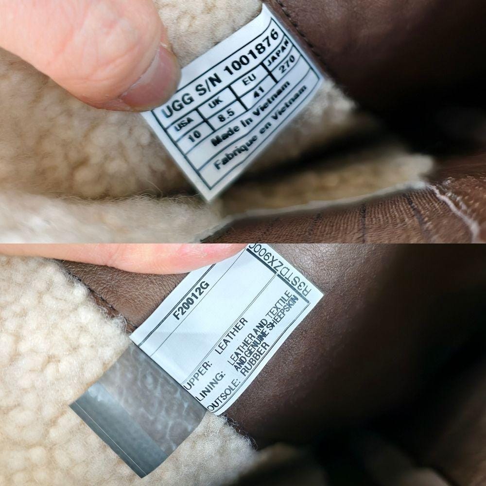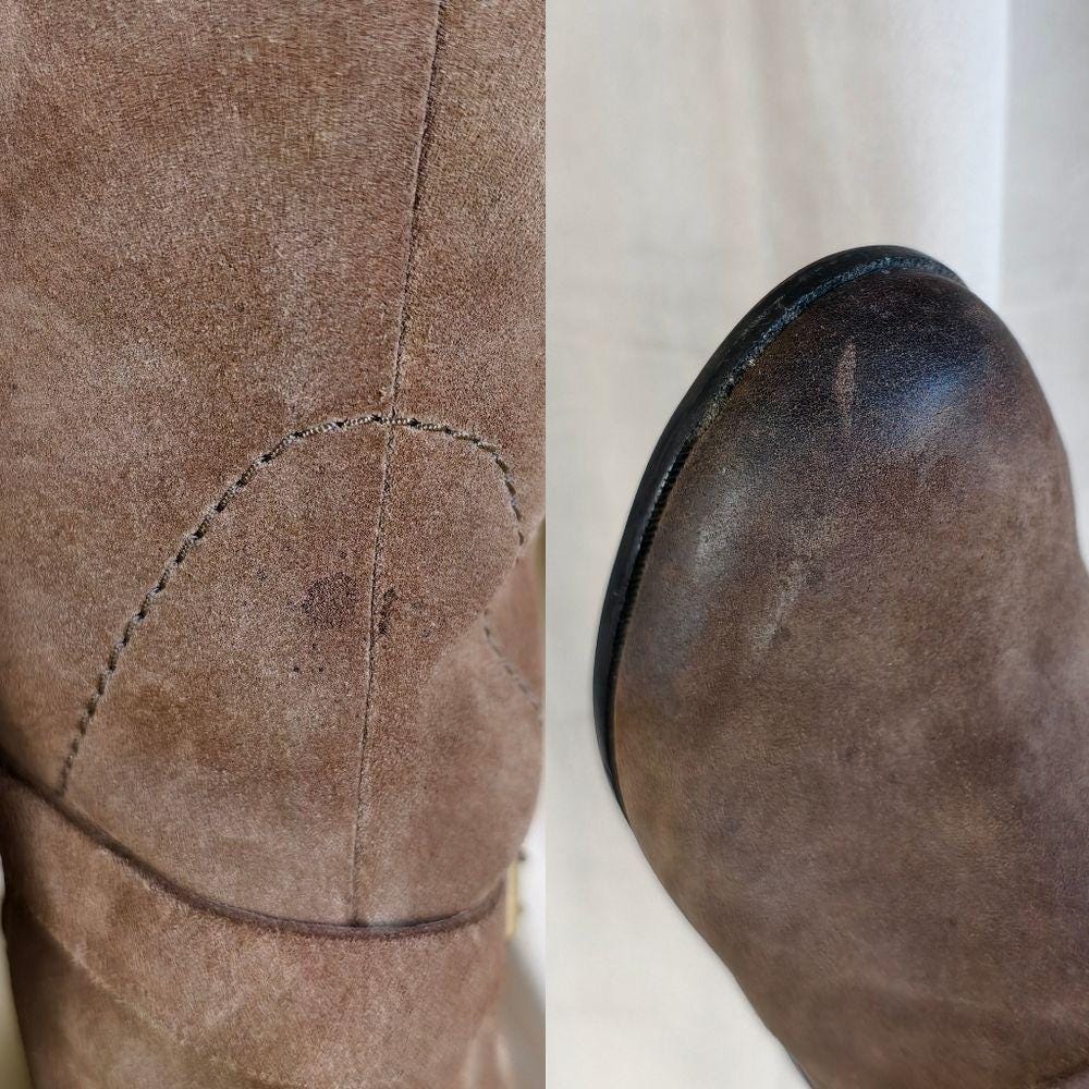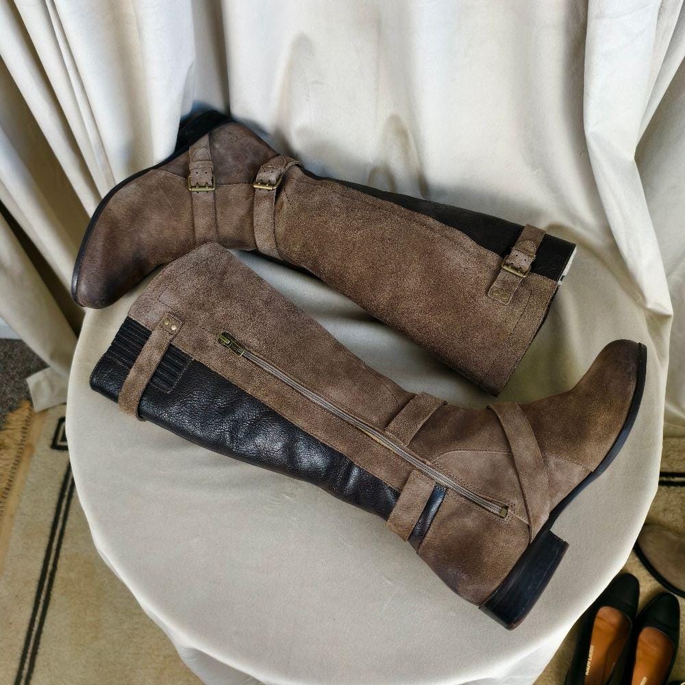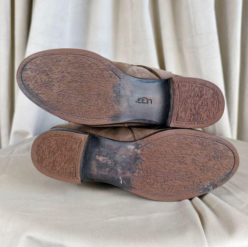 Stylish UGG riding boots with sections of sheearling lining. Two-toned brown leather. Some wear and aging on the leather, all notable marks are pictured.