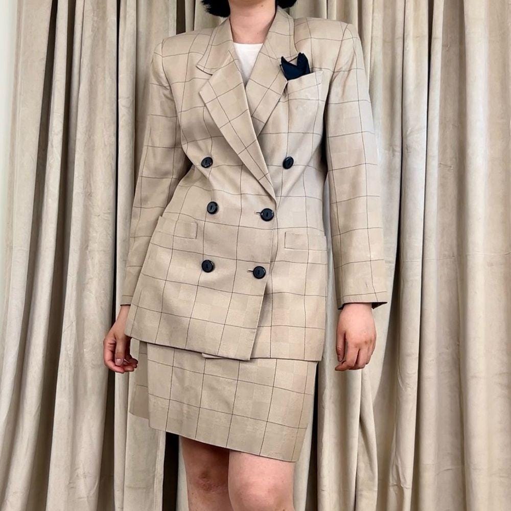 Vintage Kasper Beige Tan Checkered Plaid Double Breasted Skirt Suit Set